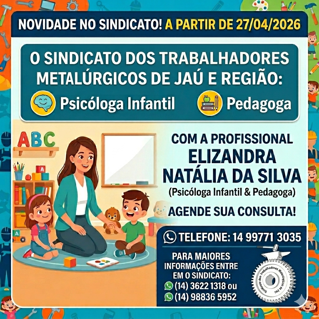Cuidar da saúde e do aprendizado dos pequenos também é nossa prioridade. A partir do dia 27/04/2026, o Sindicato dos Trabalhadores Metalúrgicos de Jaú e Região amplia seus serviços com atendimentos especializados!